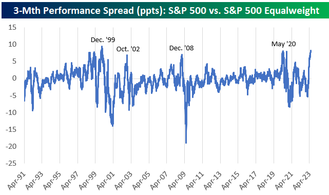 Mai così poche azioni hanno sostenuto così tanto gli indici azionari. L’S&P 500 con uguale ponderazione è ora underwater per l’anno, mentre l’S&P standard è in rialzo di circa il 10%. Lo spread di performance a 3 mesi tra i due indici è il più ampio da dicembre 1999.