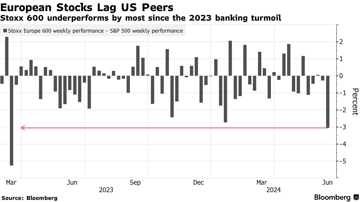 Le azioni francesi hanno perso circa 210 miliardi di dollari in valore questa settimana, una cifra paragonabile all’economia della Grecia, in seguito all’annuncio del presidente Emmanuel Macron di indire elezioni anticipate. L’indice CAC 40 ha esteso le perdite a oltre il 6%, con Societe Generale SA, BNP Paribas SA e Credit Agricole SA in calo di oltre il 10% ciascuna. La situazione ha pesato sul benchmark paneuropeo Stoxx 600, che ha registrato la settimana peggiore da ottobre. Le obbligazioni francesi sono state al centro della tempesta, con il premio richiesto dagli investitori per possedere titoli a 10 anni rispetto ai titoli tedeschi che ha raggiunto il massimo dal 2011.