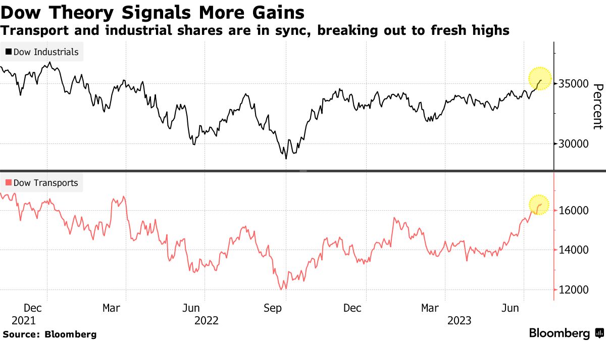 Quella appena conclusa è stata la migliore settimana del Dow Jones in 4 mesi. L’indice è stato in rialzo per 10 giorni di fila, la sua serie di vittorie più lunga da febbraio 2017. Una misura simile che monitora le compagnie aeree, ferroviarie e di autotrasporto è aumentata per la quarta settimana consecutiva. Secondo i seguaci della Teoria di Dow, la forza simultanea del Dow Jones Industrial e del Transportation è un segnale rialzista.