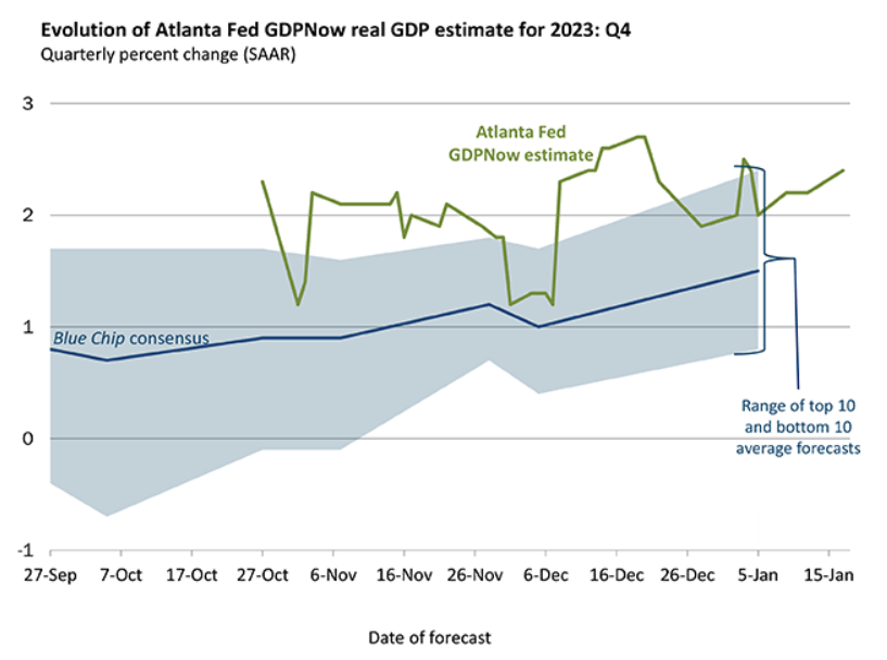 Il tanto dibattuto atterraggio morbido dell’economia statunitense si è rivelato un non atterraggio, o forse addirittura un decollo. Le spese per le festività hanno continuato a sostenere l’economia alla fine dell’anno. Alla luce del rapporto sulle vendite al dettaglio al di sopra delle aspettative, la Fed di Atlanta ha alzato la sua proiezione di crescita del PIL per il quarto trimestre, prevedendo un aumento del 2,4%.