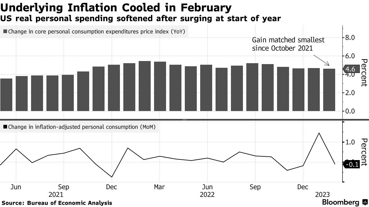 Un indicatore chiave dell’inflazione statunitense è aumentato meno del previsto il mese scorso e la spesa dei consumatori si è stabilizzata, suggerendo che la Federal Reserve potrebbe essere vicina alla fine del suo ciclo di rialzi dei tassi di interesse.