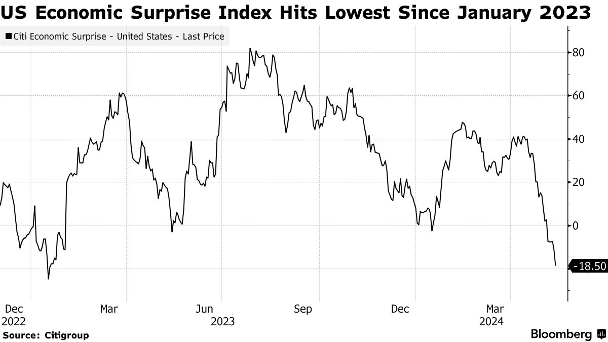 Una serie di dati inferiori alle stime – dall’occupazione ai servizi e al manifatturiero – ha portato la versione americana dell’Economic Surprise Index di Citigroup al minimo da gennaio 2023. L’indicatore misura la differenza tra i dati effettivi e le aspettative degli analisti.
