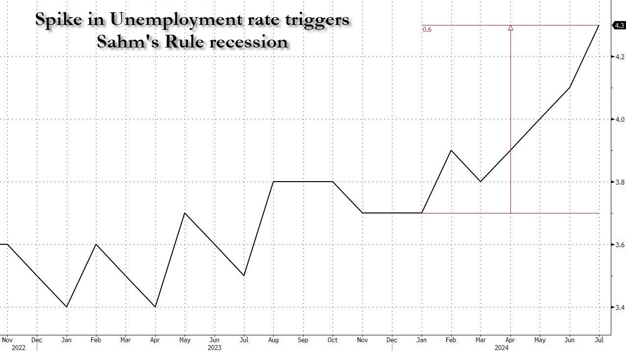 Il panic selling è peggiorato dopo l’uscita del rapporto occupazionale degli Stati Uniti. I dati non sono affatto incoraggianti. A luglio sono stati aggiunti solo 114.000 posti di lavoro, uno dei numeri più deboli dalla pandemia. La crescita occupazionale nei due mesi precedenti è stata rivista al ribasso. Il tasso di disoccupazione è salito inaspettatamente al 4,3%, innescando un indicatore di recessione attentamente monitorato: la regola di Sahm afferma che quando la media a tre mesi del tasso di disoccupazione aumenta di mezzo punto percentuale rispetto al minimo dei 12 mesi precedenti, c’è una forte probabilità che una recessione sia già in corso.