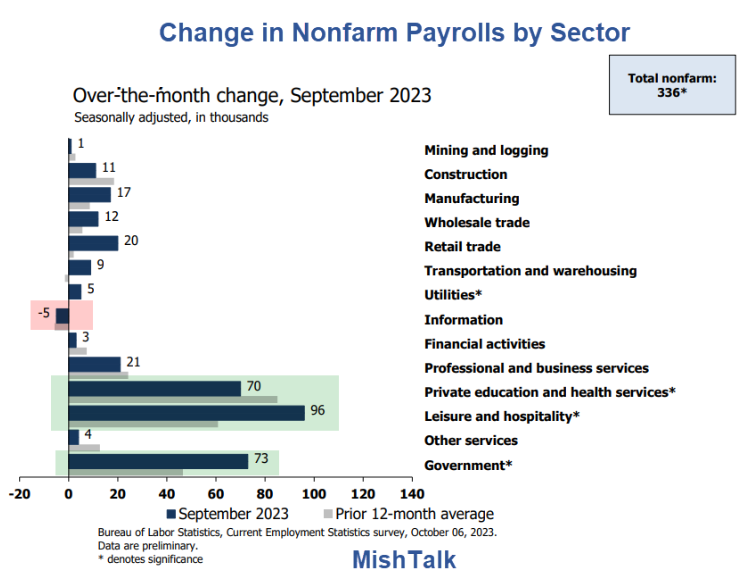 Secondo l’Establishment Survey, le assunzioni hanno avuto una base relativamente ampia, guidate dall’aumento del tempo libero e dell’ospitalità, dell’assistenza sanitaria e dei servizi professionali e aziendali. In aumento anche le buste paga del governo. Tuttavia, l’Household Survey ha indicato un aumento del numero di persone impiegate di solo 86.000 unità.