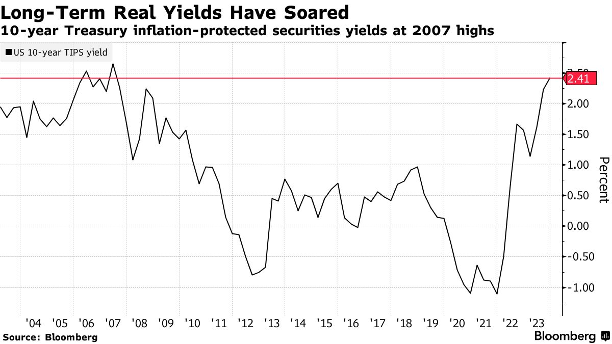 La svendita di obbligazioni è andata avanti. Le obbligazioni globali sono scese per la quinta settimana consecutiva. I rendimenti dei Treasuries a 10 e 30 anni hanno raggiunto i livelli più alti dal 2007, mentre i tassi reali sono arrivati a livelli visti raramente negli ultimi 20 anni.