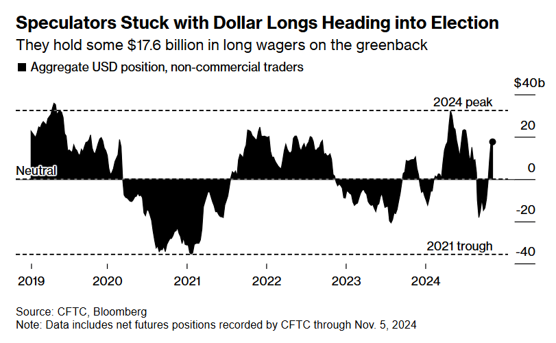 I trader avevano già preparato le proprie posizioni in favore del dollaro prima delle elezioni, con un totale di 17,6 miliardi di dollari puntati sul rialzo della valuta, come mostrano i dati della Commodity Futures Trading Commission.