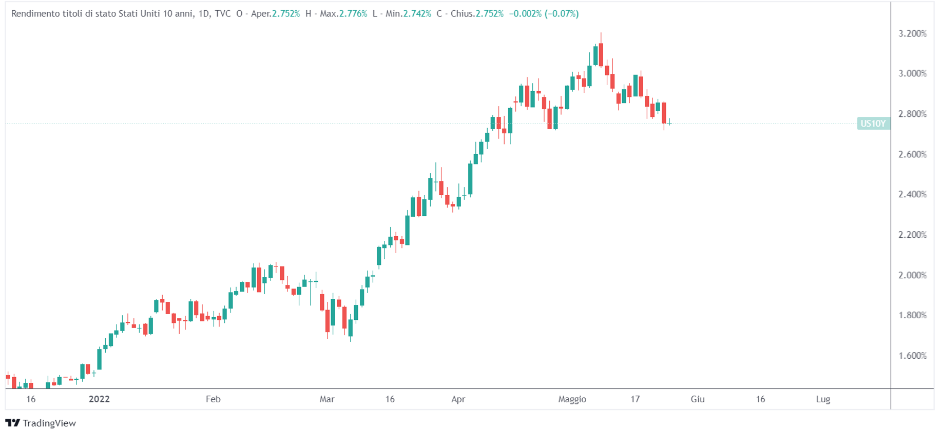Il rendimento dei Treasury a 10 anni, che può essere visto come un segnale per le aspettative di inflazione nel prossimo decennio, potrebbe contribuire a far sentire i funzionari della Fed a proprio agio. Il rendimento del decennale è sceso di quasi mezzo punto percentuale dal picco del 3,20% del 9 maggio in risposta alle crescenti preoccupazioni per una recessione.