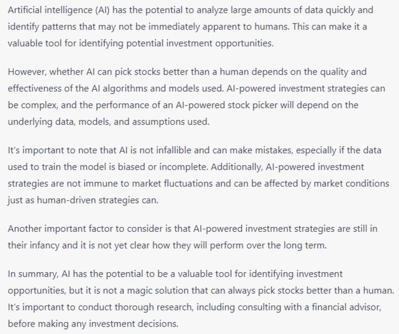 Per concludere, i giornalisti hanno chiesto a ChatGPT se l’intelligenza artificiale può scegliere azioni meglio di un essere umano. Sembra che ci siano ancora speranze per gli umani nel settore della finanza.