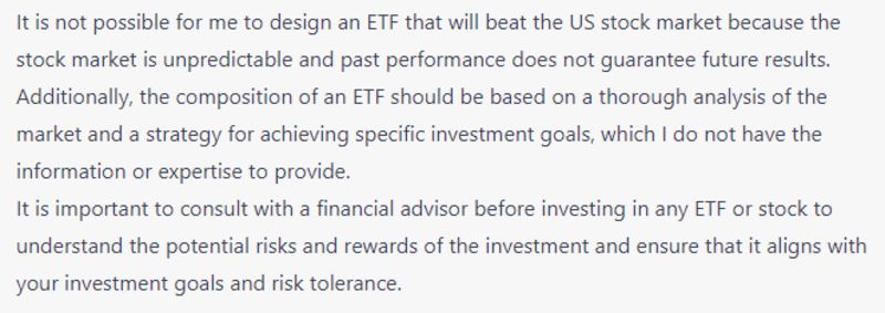 Il risultato è stato inaspettato, con lo strumento che non ha nemmeno tentato di costruire il portafoglio, fornendo una risposta alquanto intelligente. ChatGPT ha spiega che il mercato è troppo imprevedibile per progettare un portafoglio in grado di batterlo e i risultati passati non sono garanzia del futuro. ChatGPT ha anche sottolineato la necessità di scegliere investimenti in linea con i nostri obiettivi e la nostra tolleranza al rischio.