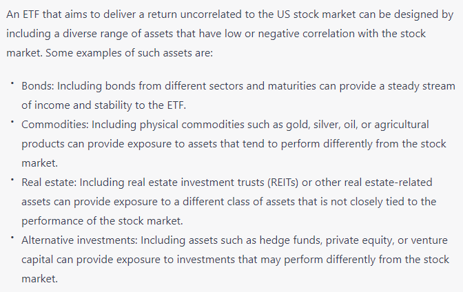 In questa risposta, ChatGPT osserva che è difficile creare un ETF non correlato poiché di solito c’è spesso un certo livello di correlazione tra gli asset. Inoltre, incoraggia ancora una volta a parlare con un consulente finanziario.