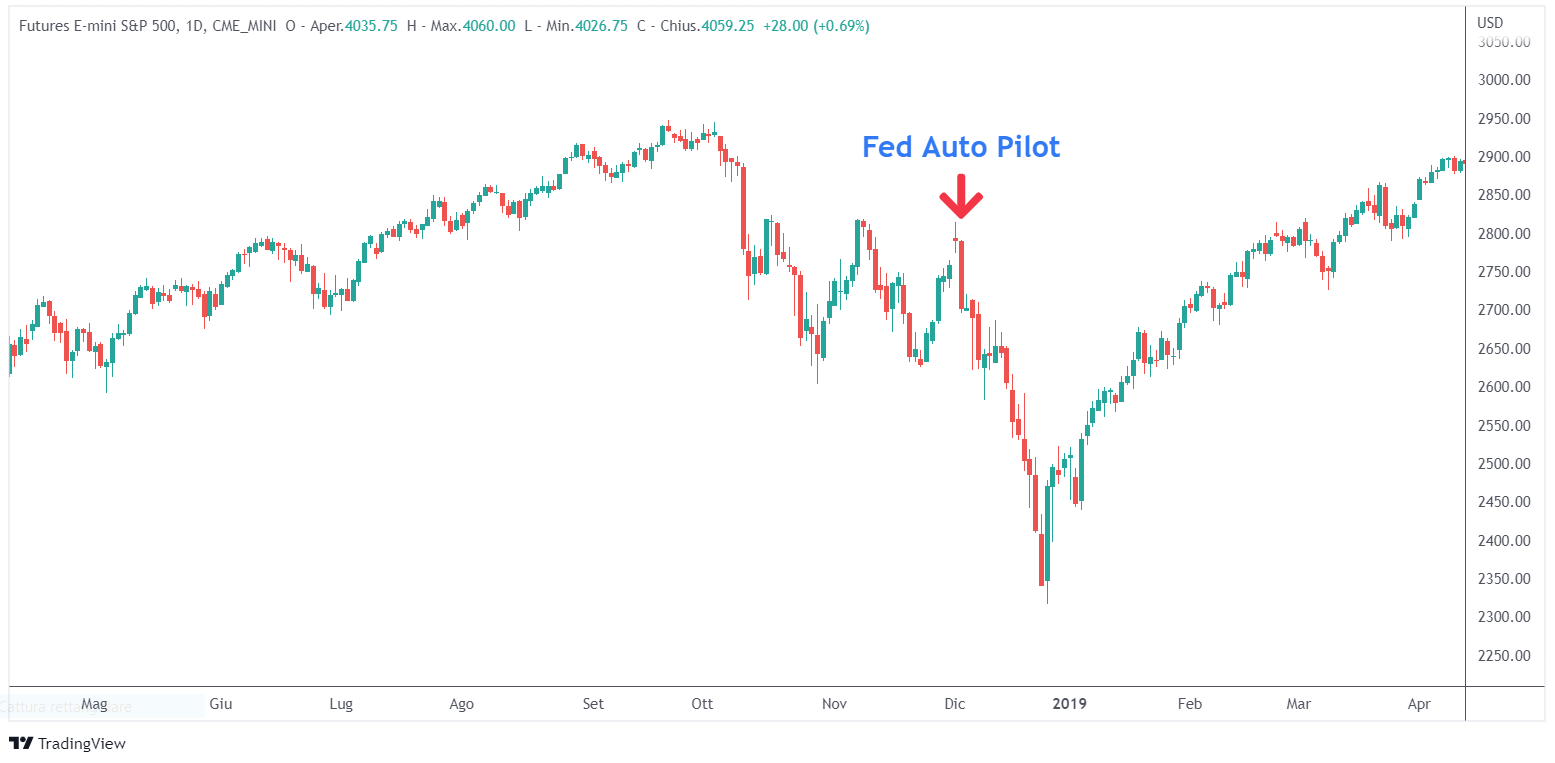 All’inizio, la Fed ha mantenuto il suo programma, con Powell che ha affermato che il QT era in modalità “pilota automatico”. A quel punto l’indice S&P 500 è crollato di quasi il 16% in tre settimane a dicembre del 2018. Successivamente, la Fed ha abbandonato gli aumenti dei tassi e ha annunciato l’eliminazione graduale del quantitative tightening a marzo 2019.