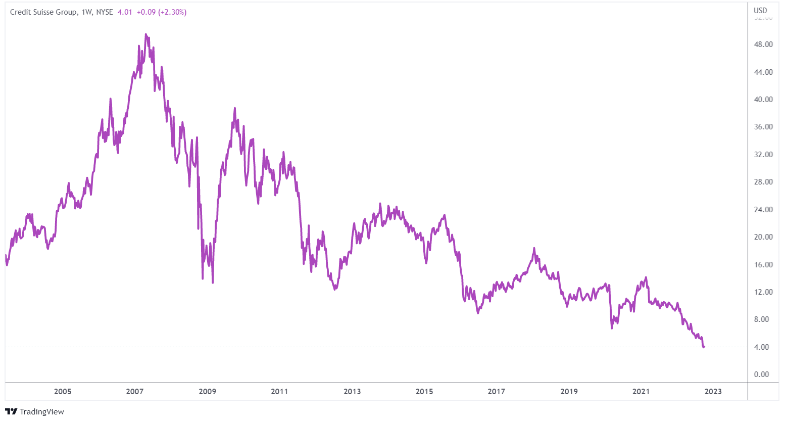 La capitalizzazione di mercato di Credit Suisse è scesa a circa 9,5 miliardi di franchi svizzeri, il che significa che qualsiasi vendita di azioni sarebbe altamente diluitiva per gli azionisti. Il valore di mercato era superiore a 30 miliardi di franchi fino a marzo 2021.