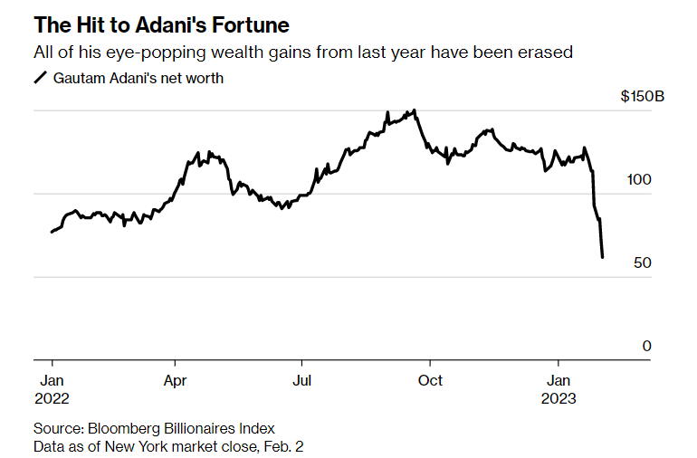 Il gruppo Adani ha perso 108 miliardi di dollari di valore di mercato da quando Hindenburg Research lo ha accusato di manipolazione delle azioni e frode contabile in un rapporto del 24 gennaio. Ma è stato solo quando il magnate ha annullato una vendita di azioni da 2,4 miliardi di dollari questa settimana che il potenziale per un impatto duraturo è diventato chiaro. La confutazione di Adani non è riuscita a rassicurare gli investitori. Una volta classificato al secondo posto tra i più ricchi del mondo, è precipitato al numero 21 del Bloomberg Billionaires Index.