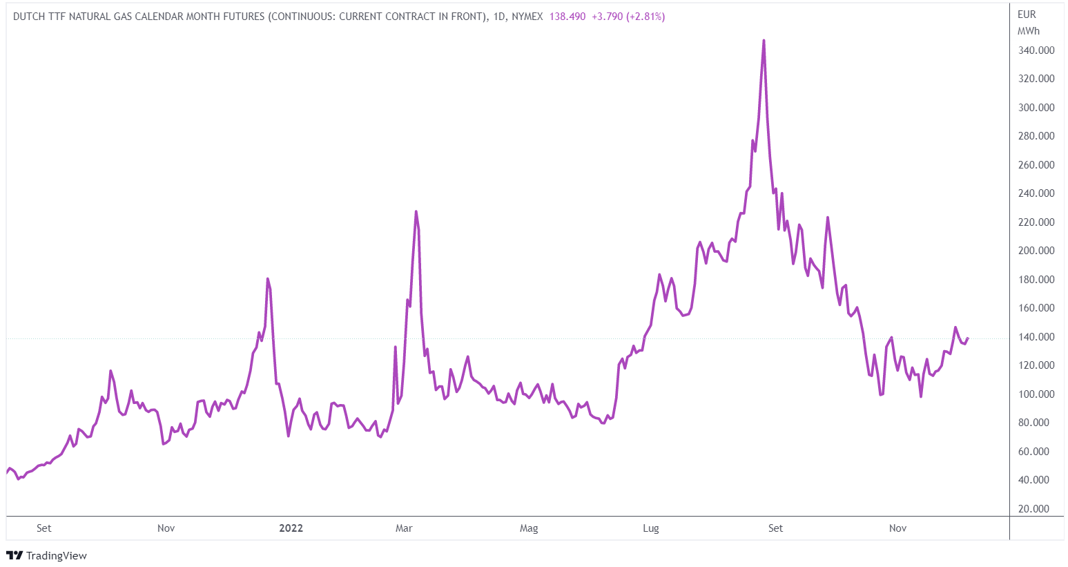 I costi energetici sono diminuiti molto negli ultimi tre mesi. I prezzi del gas naturale europeo sono scesi a circa 140 euro per megawattora da un picco di 350 fissato ad agosto. Allo stesso tempo, i prezzi dell’elettricità si sono più che dimezzati. Inoltre, l’Europa è riuscita ad accumulare scorte di gas riempiendo quasi fino all’orlo i siti di stoccaggio e uno degli autunni più caldi mai registrati ha ridotto significativamente i consumi. Tutto ciò ha fatto emergere la narrativa che sostiene che il peggio della crisi energetica in Europa è passato.