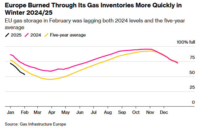 Diversi fattori hanno contribuito a una riduzione più rapida del solito delle scorte di gas in Europa. L’inverno 2024/25 è stato più rigido rispetto agli anni precedenti, mentre una riduzione della produzione di energia eolica ha aumentato il consumo di gas per compensare il calo delle rinnovabili. L’interruzione delle forniture russe attraverso l’Ucraina ha ridotto ulteriormente l’offerta.