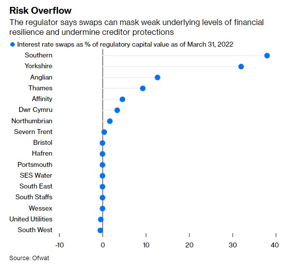 In un documento del 2021, Ofwat ha notato l’uso rischioso degli interest rate swaps, affermando che avrebbero potuto mascherare i deboli livelli sottostanti di resilienza finanziaria, minare le protezioni dei creditori esistenti e rinviare una difficile posizione di resilienza finanziaria al futuro. Southern Water aveva una passività di swap di 2,1 miliardi di sterline pari al 38% del suo valore di capitale regolamentare, mentre la percentuale per Yorkshire Water era del 32%. Thames Water si è classificata al quarto posto secondo questa misura, con il 9,3%.