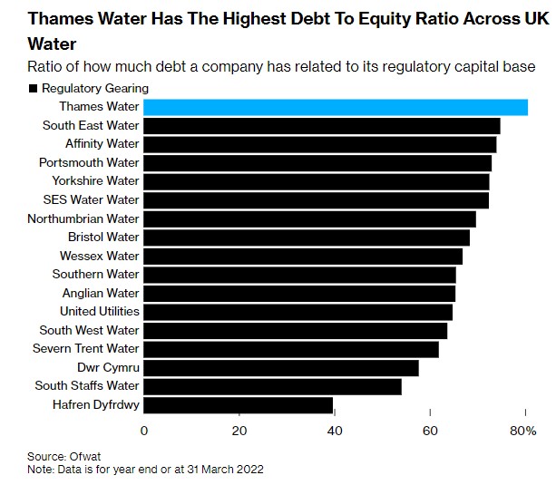 Ofwat utilizza una metrica nota come capital gearing per misurare la quantità di debito che le diverse società idriche hanno in proporzione al loro capitale. Secondo questa misura, a marzo 2022 Thames Water era la più esposta, ma altre società idriche non erano molto indietro.