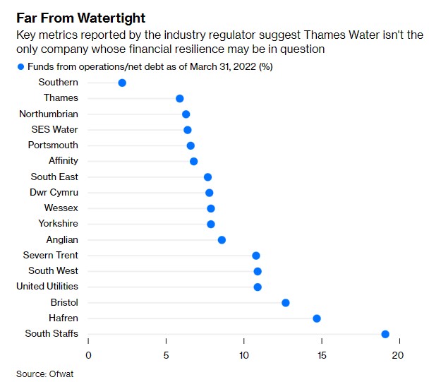Altri criteri utilizzati da Ofwat come misura della resilienza finanziaria mostrano che Thames Water non si distingue particolarmente. La società ha il secondo rapporto più debole tra fondi operativi e indebitamento netto. Il fornitore di spicco in questa misura è Southern Water Services, di Macquarie Asset Management.