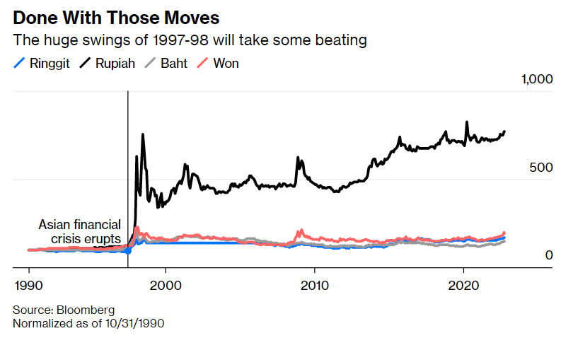 Le valute asiatiche sono diminuite quest’anno, ma l’entità dei cali impallidisce con quella della crisi valutaria precedente. Quest’anno, il ringgit malese ha perso il 10% rispetto al dollaro, il baht thailandese è sceso dell’11%, il won coreano è arretrato di circa il 16% e la rupia indonesiana è scivolata del 6%. Queste percentuali sono solo frazioni dei crolli del 1997.