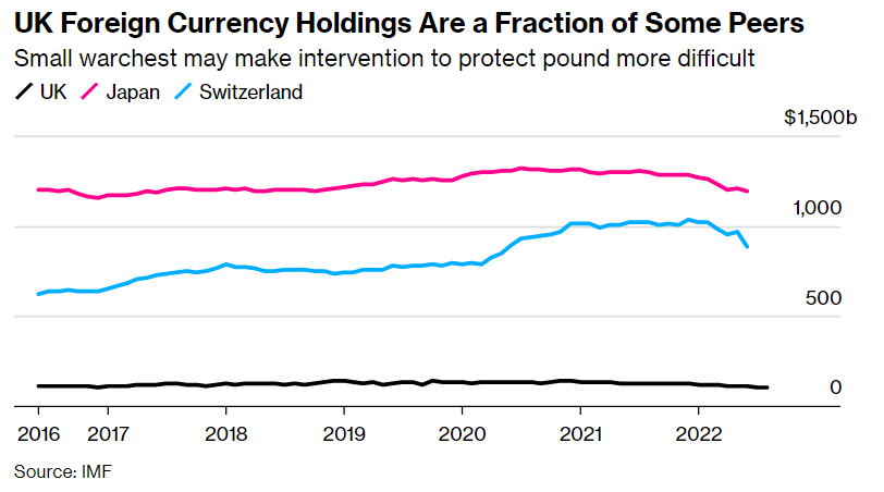 Secondo i dati del Fondo monetario internazionale, il Regno Unito aveva 108 miliardi di dollari di riserve in valuta estera alla fine di agosto. Le partecipazioni in valuta estera del Regno Unito sono solo una frazione di quelle di altri peer. Ad esempio, il Giappone, che è intervenuto per sostenere la sua valuta la scorsa settimana, ha riserve pari a $ 1,17 trilioni.