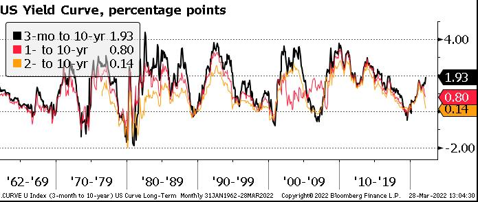 Esistono opinioni discordanti che rispondono a questa domanda. Il quesito è importante poiché curve diverse possono inviare segnali contrastanti. La curva degli Stati Uniti a due anni e 10 anni è forse la più popolare. Lo spread è passato brevemente in territorio negativo alla fine di marzo. Ciò farebbe pensare che una recessione sia imminente. Tuttavia, secondo la Fed, lo spread tra i rendimenti a 10 anni e quelli a tre mesi è il migliore nel prevedere le recessioni. Questo spread è tutt’altro che invertito, anzi si trova a livelli di “steepening” che si vedevano dal 2016.
