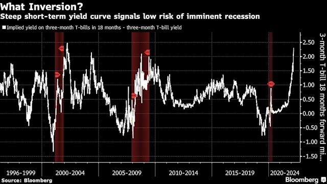 Un altro spread importante per Jerome Powell è il cosiddetto “spread forward a breve termine”, ovvero la differenza tra il tasso a termine a 18 mesi e il rendimento a tre mesi. Anche questo spread non sta suggerendo l’imminenza di una recessione.
