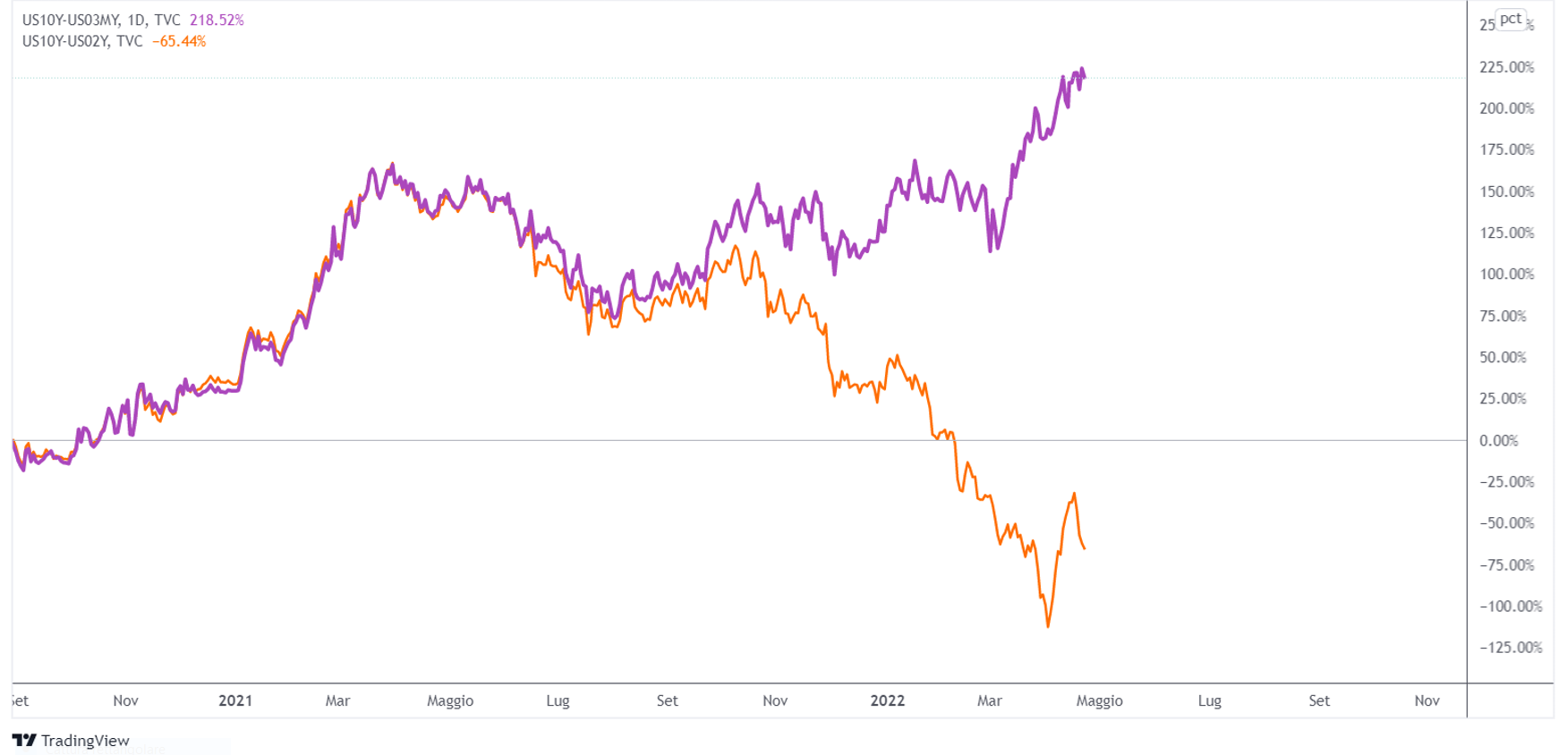 Nonostante le preferenze della Fed, dobbiamo notare che l’inversione della curva 10/2 ha sempre anticipato le recessioni. In passato quando si sono verificate delle divergenze con altri spread, esse si sono in seguito corrette. In altre parole, le parti della curva che sembravano suggerire un’irripidimento si sono successivamente unite all’inversione dello spread 10/2.