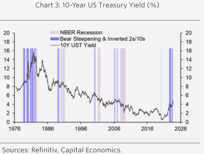 Il bear steepening che porta la curva a “dis-invertire è molto raro ma, quando si verifica, generalmente è seguito presto da una recessione. Il seguente grafico di Capital Economics mostra che tali irripidimenti sono stati seguiti da cali significativi dei rendimenti dei titoli di Stato a lungo termine.