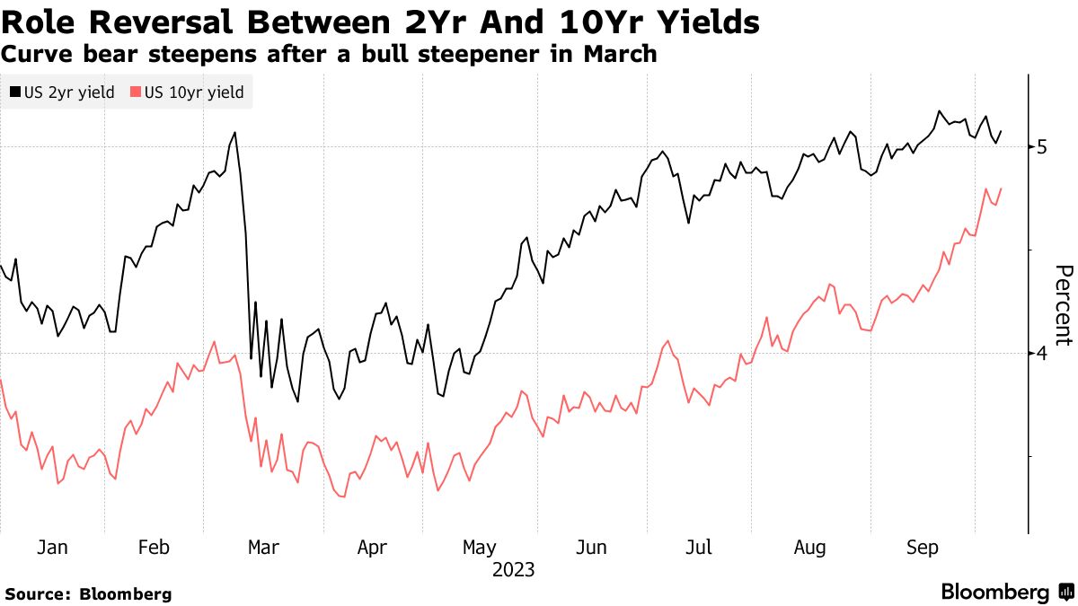 Il mercato obbligazionario statunitense è passato rapidamente dall’allarme di una recessione al segnale che i tassi di interesse rimarranno più alti per un periodo più lungo. Per vedere il cambiamento nel sentiment, basta guardare l’irripidimento della curva dei rendimenti.