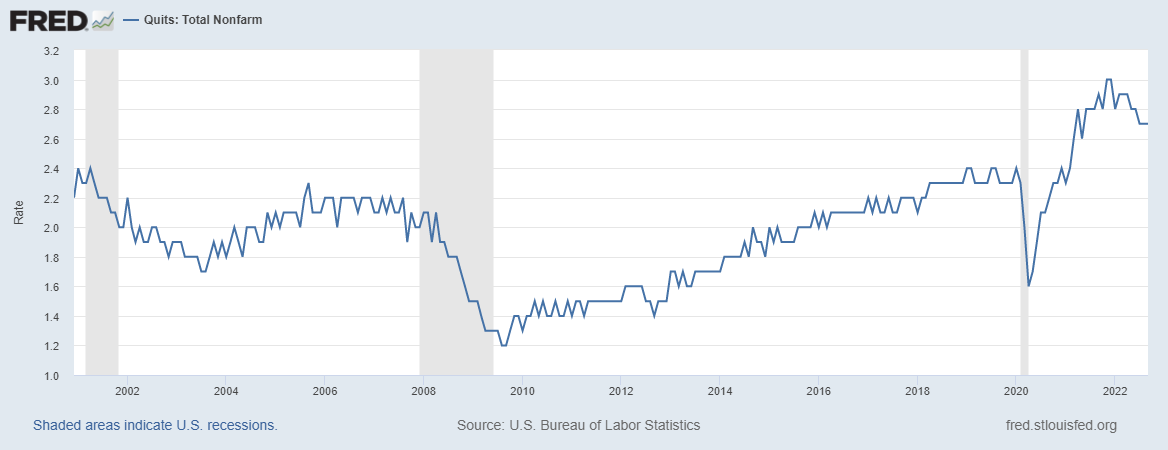 I dati del JOLTS mostrano che la domanda di lavoratori è forte e il mercato del lavoro sta reggendo bene l’aumento dei tassi. Nonostante tutti i discorsi sul quiet quitting e sulla Great Resignation, le opportunità di lavoro sono più numerose dei disoccupati. Le dimissioni e i tassi di abbandono sono aumentati, ma non sono andati fuori dalla classifica. I licenziamenti, sebbene ampiamente segnalati, sono al di sotto dei livelli pre-pandemia.