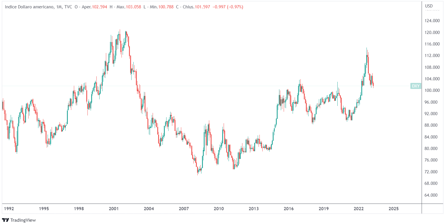 Le voci sulla morte della valuta statunitense sono tanto esagerate quanto ripetute. Negli ultimi tempi c’è un gran parlare di de-dollarizzazione, ovvero del fatto che il dollaro stia perdendo il suo ruolo nell’economia globale. Secondo il gruppo di ricerca GlobalData, la discussione sullo status del dollaro su piattaforme come Twitter e Reddit è aumentata del 600% durante il primo trimestre, rispetto agli ultimi tre mesi del 2022. Ciò è correlato al fatto che il suo valore rispetto ad un paniere di valute sta diminuendo. Tuttavia, vale la pena notare che il dollaro è più forte di quanto non sia stato per la maggior parte di questo secolo.