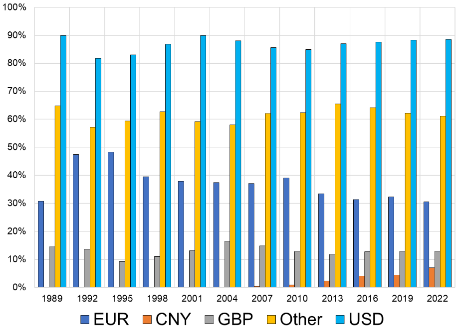 Le indagini triennali sui mercati dei cambi condotte dalla Bank for International Settlements confermano che, sebbene il dollaro stia perdendo una piccola quota di mercato, rimane molto avanti rispetto alla concorrenza.