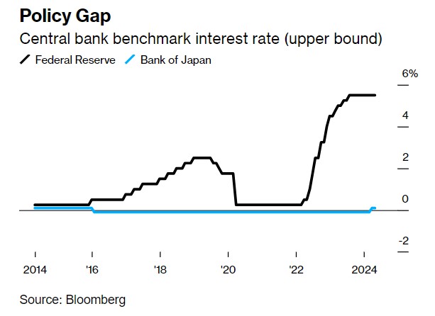 La debolezza dello yen è principalmente causata dal divario dei tassi di interesse tra Giappone e Stati Uniti. La principale misura del valore dello yen è contro il dollaro USA. A marzo, la BOJ ha finalmente seguito la Fed nel restringere la politica monetaria. Tuttavia, USA e Giappone sono ancora molto lontani sui tassi di interesse. Il tasso a breve termine del Giappone dello 0,1% – in aumento rispetto al -0,1% – si confronta con il 5,5% della Fed. Questi tassi fissano il punto di riferimento per i rendimenti obbligazionari e i ritorni attesi sugli asset in entrambi i paesi. Per gli investitori globali, gli asset statunitensi sono molto più attraenti. Questo significa anche che vogliono dollari più che yen.