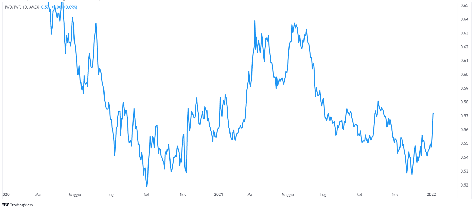 IWD è un ETF che ci fornisce un’ottima idea sulle performance delle value stocks. La sua esposizione comprende le large cap, le mid cap e persino alcune small cap. IWF è uno degli ETF più popolari che copre le growth stocks. Le value stocks tendono a sovraperformare le growth stocks quando l’ottimismo sulle prospettive economiche è maggiore.