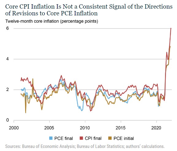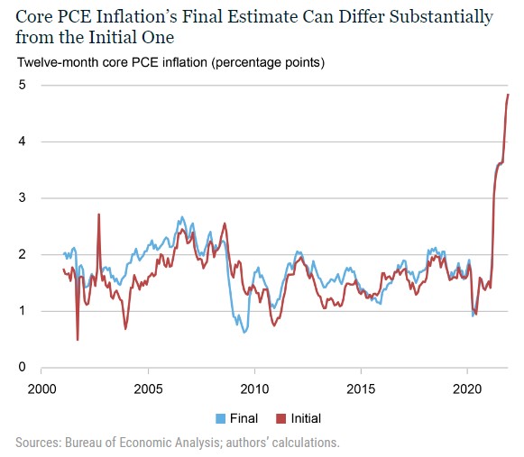Le stime dell’inflazione mensile annualizzata nel core PCE dal 2001 sono state riviste fino a 6 punti percentuali. Oltre il 15% delle revisioni è stata superiore a un punto percentuale. Le revisioni non solo sono considerevoli, ma si verificano ripetutamente poiché il Bureau of Economic Analysis rivede il PCE come parte del processo di revisione dei conti nazionali del reddito e del prodotto. Ad esempio, il numero di settembre 2018 è stato rivisto cinque volte dopo la sua pubblicazione iniziale: due volte nei mesi successivi e altre tre volte a luglio 2019, luglio 2020 e luglio 2021.