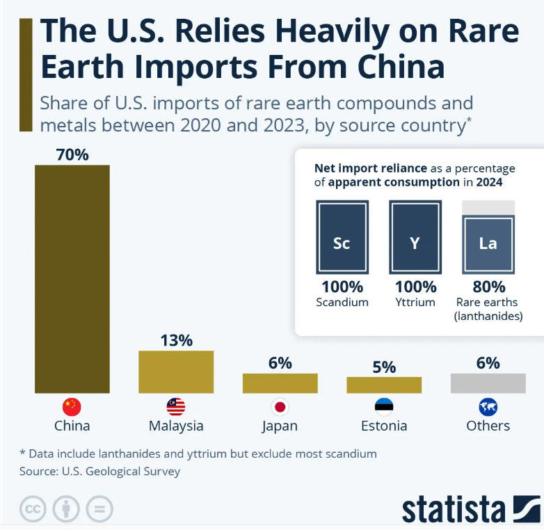 Secondo i dati più recenti del U.S. Geological Survey, gli Stati Uniti coprono con l’importazione circa l’80% del proprio fabbisogno di terre rare. Di questa quota, oltre il 70% proviene dalla Cina. Il resto arriva da Malesia, Giappone e Estonia.