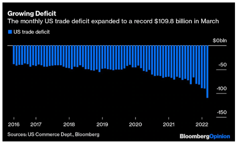 Gli effetti negativi di un dollaro robusto sulle multinazionali americane sono mostrati dai numeri del commercio estero. Dall’inizio del 2020, le esportazioni statunitensi sono aumentate da $ 2,46 trilioni a $ 2,91 trilioni, ma le importazioni sono balzate da $ 3,01 trilioni a $ 4,22 trilioni. Quindi, il deficit del commercio estero è passato da $ 546 miliardi a $ 1,32 trilioni. Anche la crescita economica più alta negli Stati Uniti stimola le importazioni.