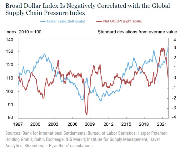 Un dollaro forte tende inoltre a ridurre la disponibilità dei finanziamenti in dollari necessari per sostenere i collegamenti della catena di approvvigionamento. Di conseguenza, i movimenti del dollaro influenzano l’attività globale attraverso questo canale finanziario. Il grafico seguente mostra la correlazione inversa tra l’indice del dollaro e il Global Supply Chain Pressure Index (GSCPI) della Fed di New York, una misura degli squilibri della catena di approvvigionamento globale.