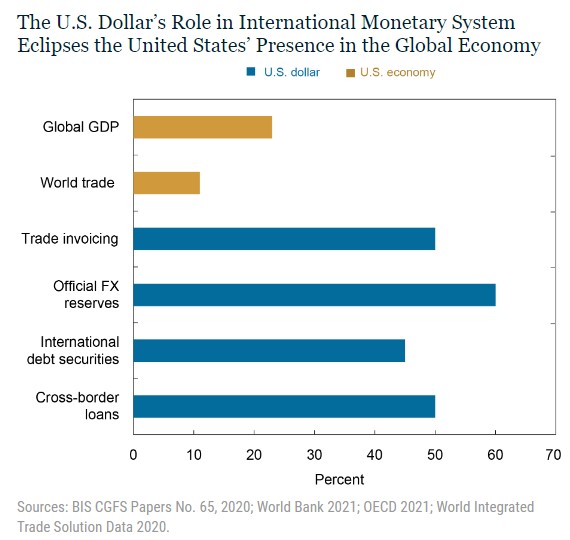 Il dollaro è la valuta di fatturazione dominante nel commercio internazionale. Ciò amplifica l’impatto dei movimenti del dollaro sulla produzione globale. Oltre al suo ruolo dominante nel commercio, il dollaro USA è anche la valuta dominante nel sistema bancario internazionale. Circa il 60% delle passività e dei crediti internazionali e in valuta estera sono denominati in dollari USA.