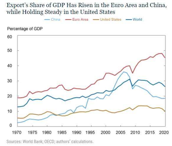 La seconda asimmetria si verifica poiché l’economia statunitense è meno esposta ai movimenti del commercio globale rispetto ai suoi partner commerciali. Il grafico seguente mostra che negli ultimi cinquant’anni il commercio ha svolto un ruolo sempre più importante per molti paesi, in particolare Euro Area e Cina, dove la dimensione delle esportazioni in percentuale del PIL è più che raddoppiata. Nello stesso periodo, l’importanza del commercio negli Stati Uniti è rimasta relativamente bassa e stazionaria.