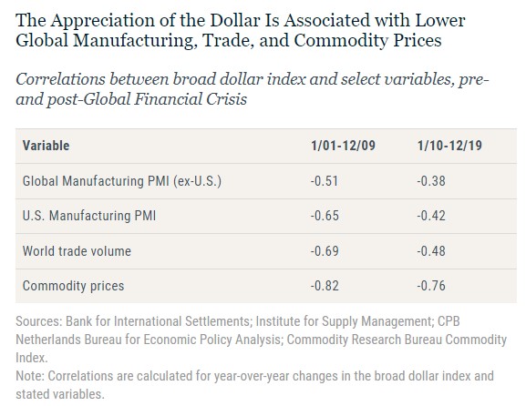 Tutti questi risultati teorici sono confermati dai dati. La tabella seguente mostra la relazione tra l’indice del dollaro e gli indici PMI per il settore manifatturiero statunitense e globale (ex-USA) nei periodi pre e post crisi finanziaria globale. Le correlazioni elencate nella tabella suggeriscono che un ampio apprezzamento nominale del dollaro è associato a una contrazione dell’attività manifatturiera. Questa relazione è stabile nei due sottoperiodi considerati. Allo stesso modo, un apprezzamento del dollaro è associato negativamente ai prezzi delle materie prime e al commercio mondiale.