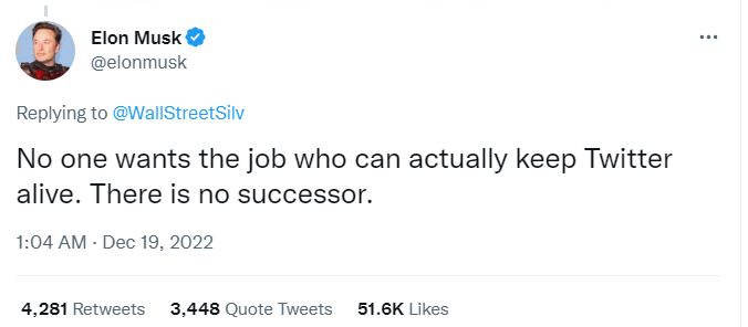 Non c’è un chiaro sostituto come capo di Twitter, con quasi tutti i dirigenti di alto livello che sono stati licenziati o si sono dimessi negli ultimi mesi. Musk ha aggiunto nei tweet successivi alla dichiarazione delle sue dimissioni: “Nessuno vuole il lavoro che può effettivamente mantenere in vita Twitter. Non c’è un successore” e “L’azienda è sulla corsia preferenziale verso il fallimento da maggio”.