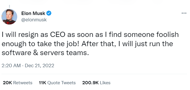 Elon Musk ha annunciato le sue dimissioni da CEO di Twitter Inc. non appena avrà trovato qualcuno abbastanza folle da accettare l’incarico, ha dichiarato in un tweet. Dopodiché, ha detto che gestirà solo i team di software e server.