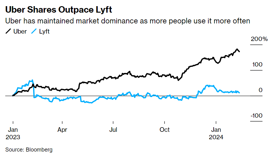 Mentre Lyft ha un’immagine socialmente responsabile e incentrata sulla comunità, Uber ha dovuto affrontare diverse critiche riguardo alla sua cultura aziendale e alle pratiche commerciali. Tuttavia, Lyft è ancora in ritardo rispetto a Uber: detiene circa il 30% del mercato statunitense del rideshare rispetto al 70% di Uber. La posizione dominante di Uber si riflette nella sua performance azionaria.