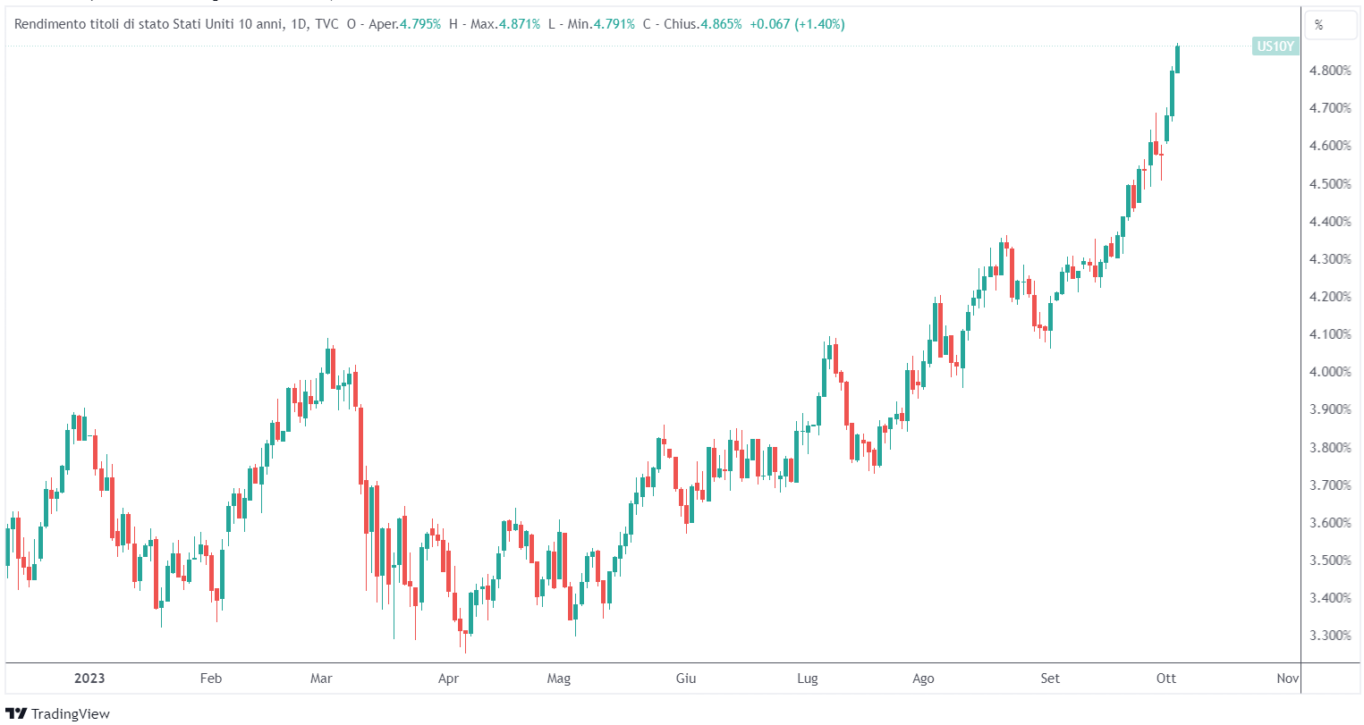 Dopo la notizia dell’estromissione di McCarthy dalla carica di presidente della Camera, i titoli del Tesoro hanno esteso le perdite. I rendimenti delle obbligazioni statunitensi a 10 e 30 anni hanno raggiunto nuovi massimi pluriennali. Wall Street sta speculando sul fatto che i tassi sulle obbligazioni a più lunga scadenza raggiungeranno il 5%.