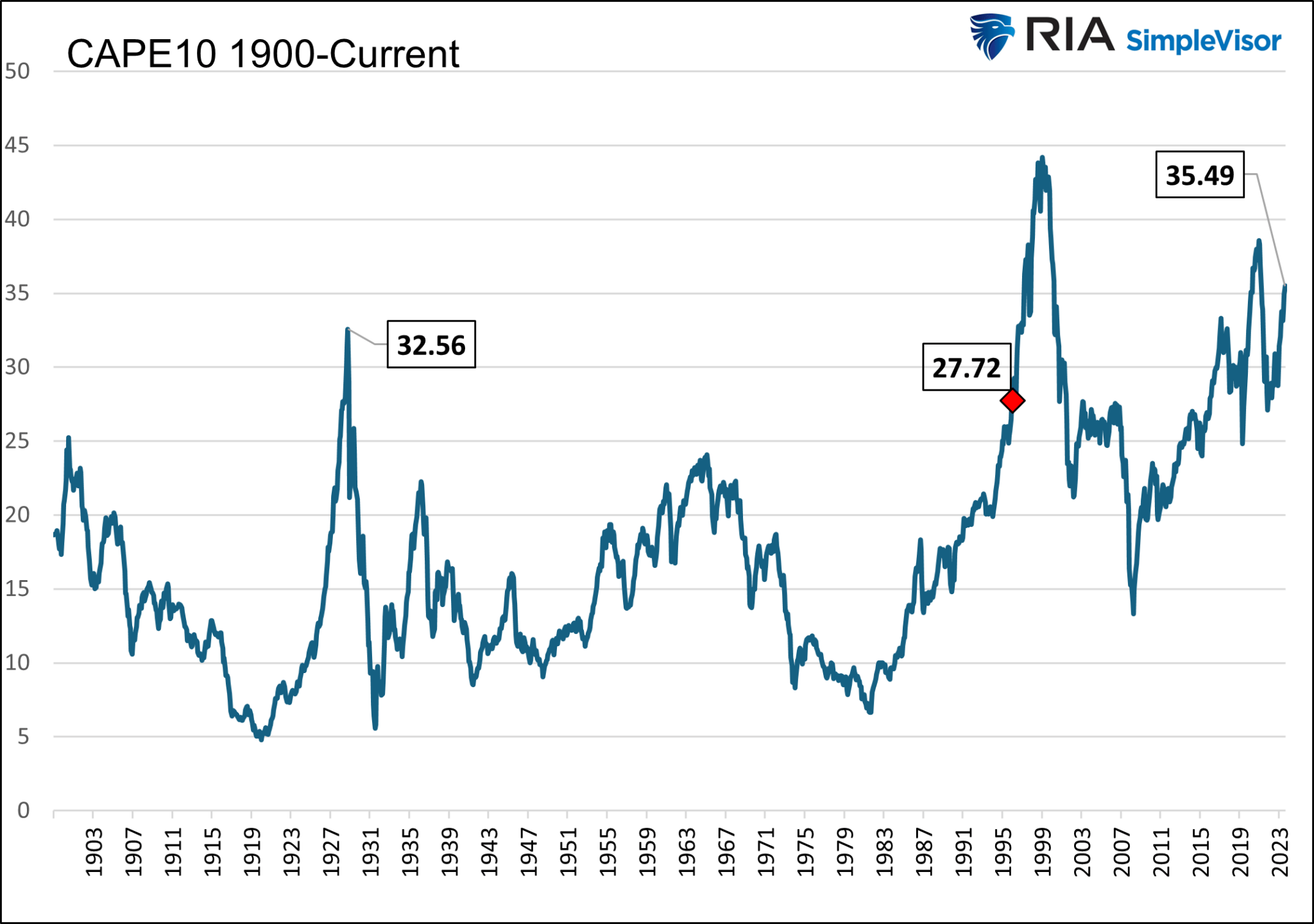 Gli attuali rapporti prezzo/utili (P/E ratio) e altri indicatori di valutazione si trovano a livelli storicamente elevati. Il CAPE Ratio (Cyclically Adjusted Price-Earnings), ad esempio, è a livelli che non si vedevano dal 1929 e dal picco della bolla Nifty Fifty degli anni ’60. Questo indicatore misura il prezzo delle azioni in rapporto agli utili medi degli ultimi 10 anni.