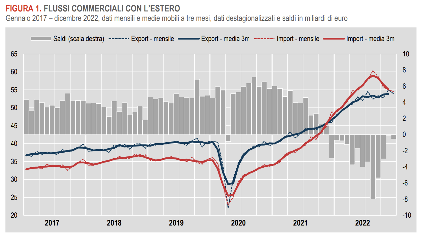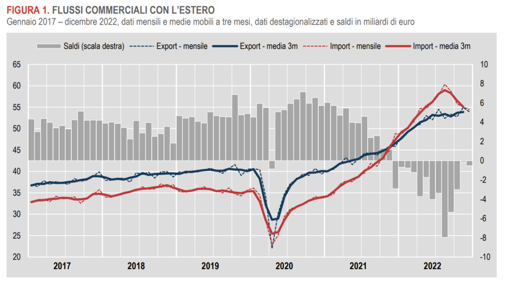 Nel mese di dicembre 2022, l’Istat ha stimato una diminuzione delle esportazioni (-1,9%) e delle importazioni (-1,1%), causata dalla riduzione delle vendite sia nell’UE (-1,2%) che al di fuori dell’UE (-2,6%). Tuttavia, a dicembre la bilancia commerciale ha registrato un surplus di 1,067 miliardi di euro.