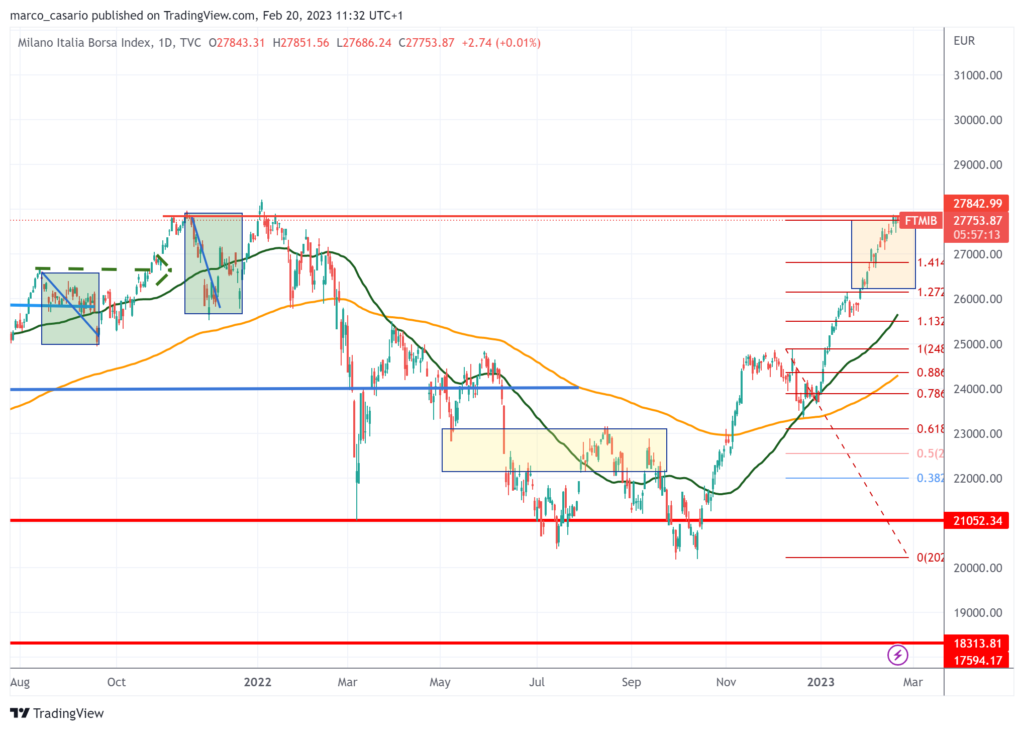 Il FTSE Mib, l’indice della Borsa Italiana, sembra però non volersi fermare ed è oggi arrivato ad una soglia importante che coincide con un livello tecnico che in passato ha agito da resistenza, e con l’estensione di Fibonacci della precendente gamba rialzista: