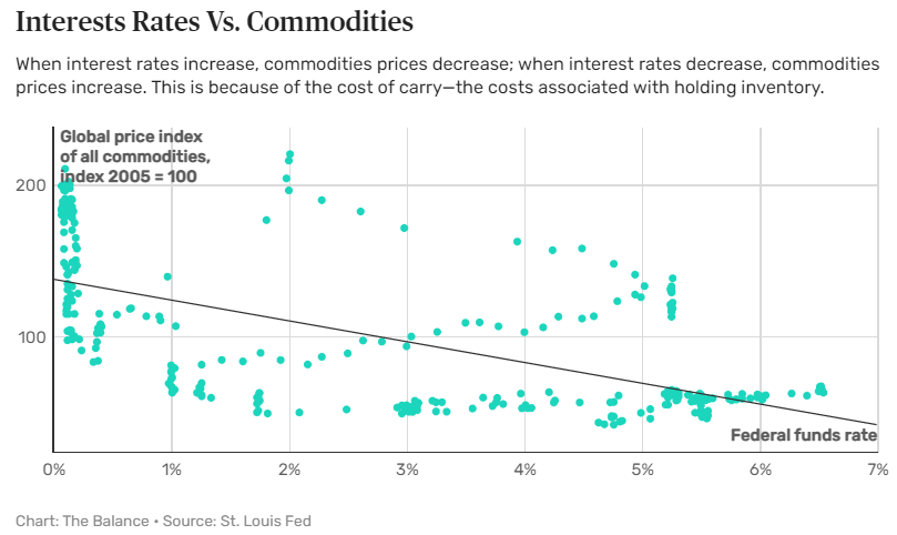 Quando i tassi d’interesse aumentano, i prezzi delle materie prime diminuiscono e viceversa. Tassi d’interesse elevati diminuiscono la domanda e di conseguenza anche i prezzi delle materie prime.