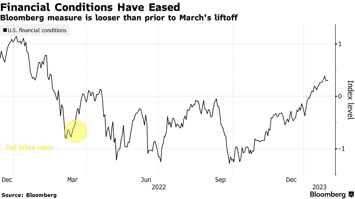 L’enfasi sulle condizioni più restrittive nell’ultimo anno è stata presa dai trader come prova che gli ultimi rally delle azioni e del credito non sono una preoccupazione importante per i responsabili politici, lasciandoli liberi di continuare gli aumenti dei tassi.